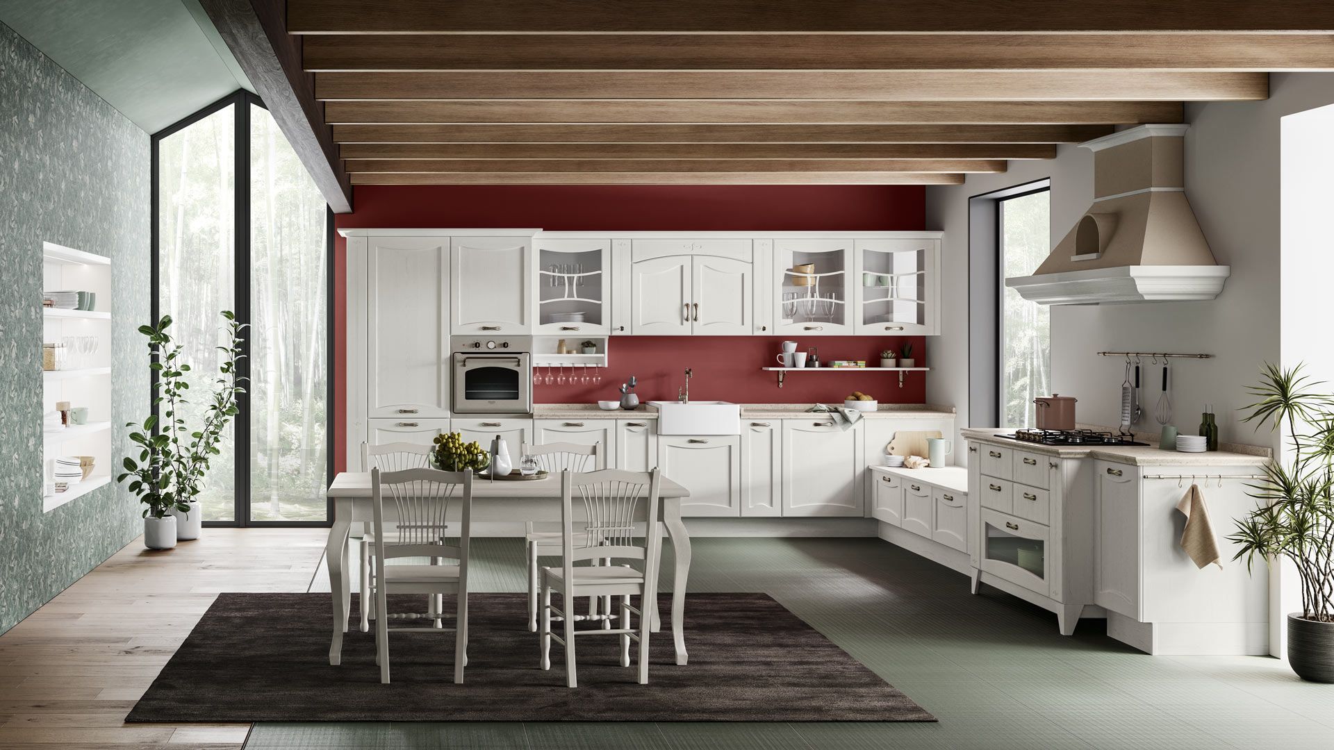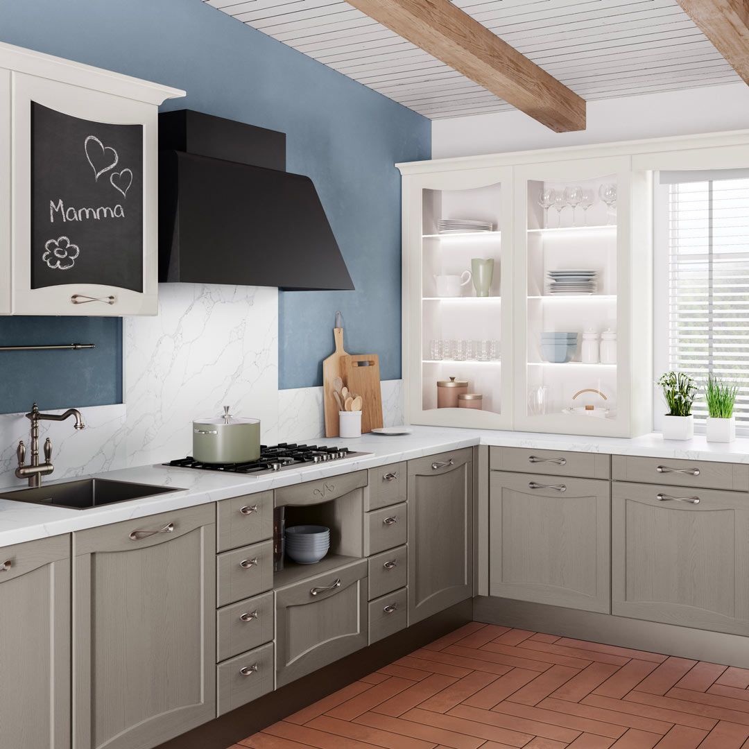 In Aurea, la classicità si riflette nella composizione, nei colori e nelle finiture, creando un piccolo mondo perfetto. Le ante e la cappa con finiture lavagna permettono di annotare con parole e frasi ciò che ti passa per la mente. Questa cucina è il luogo ideale per cucinare, mangiare, conversare... e scrivere!