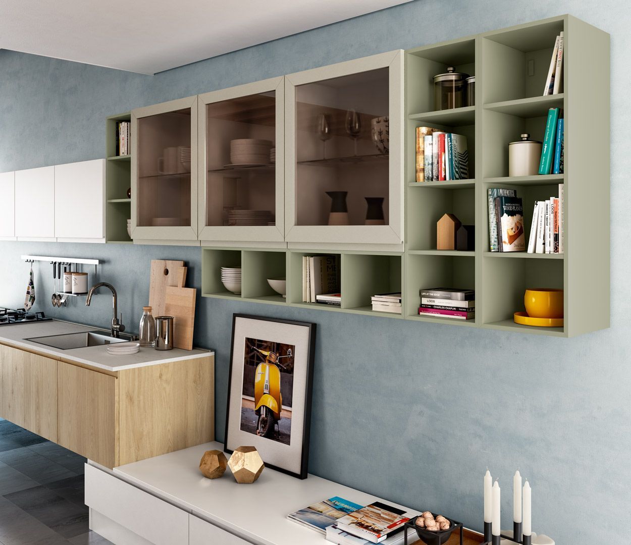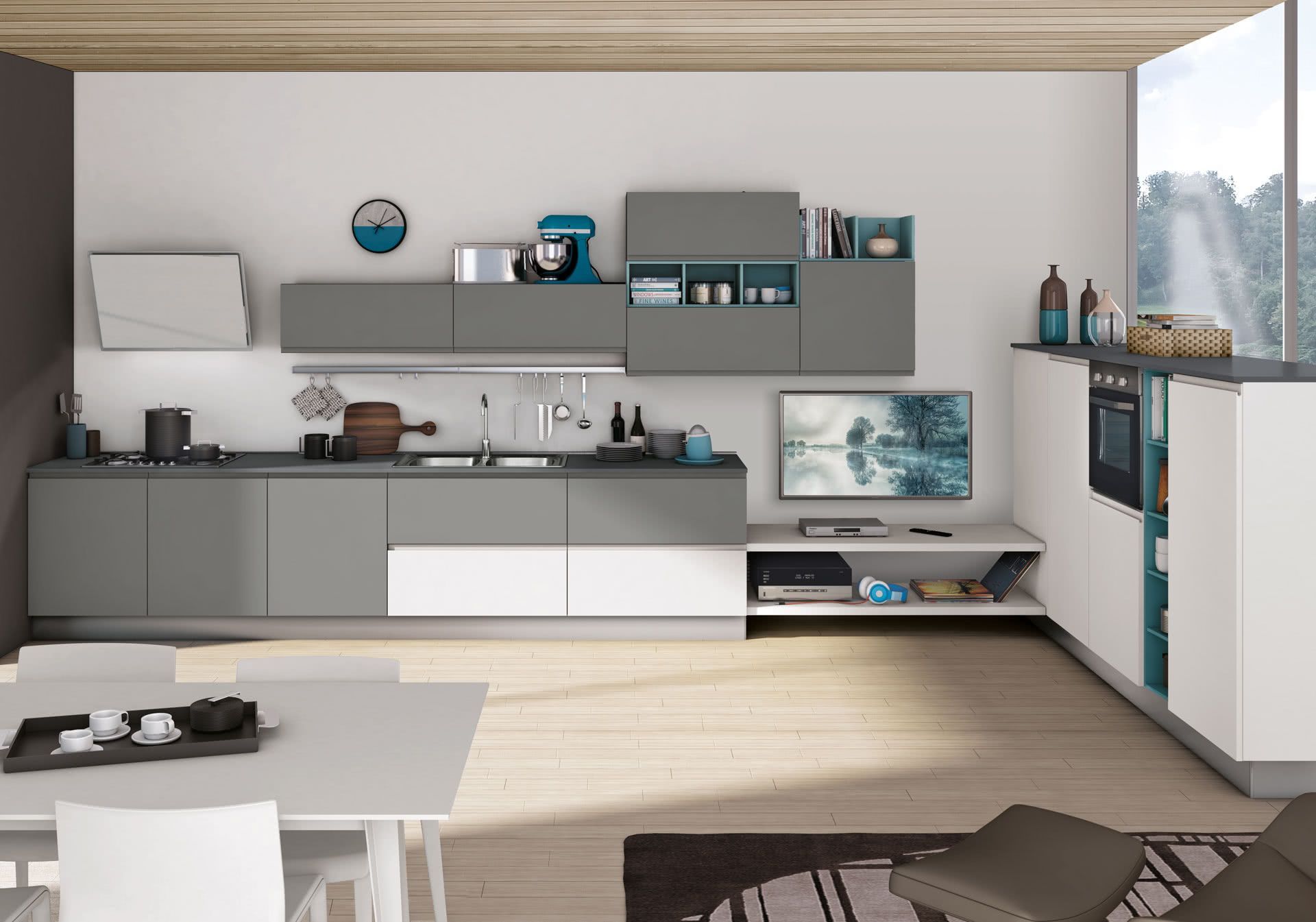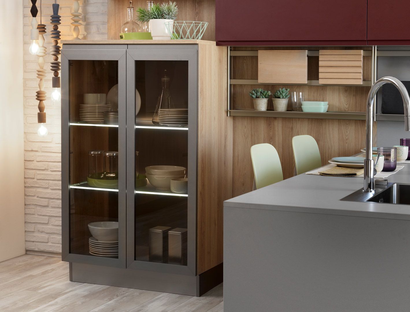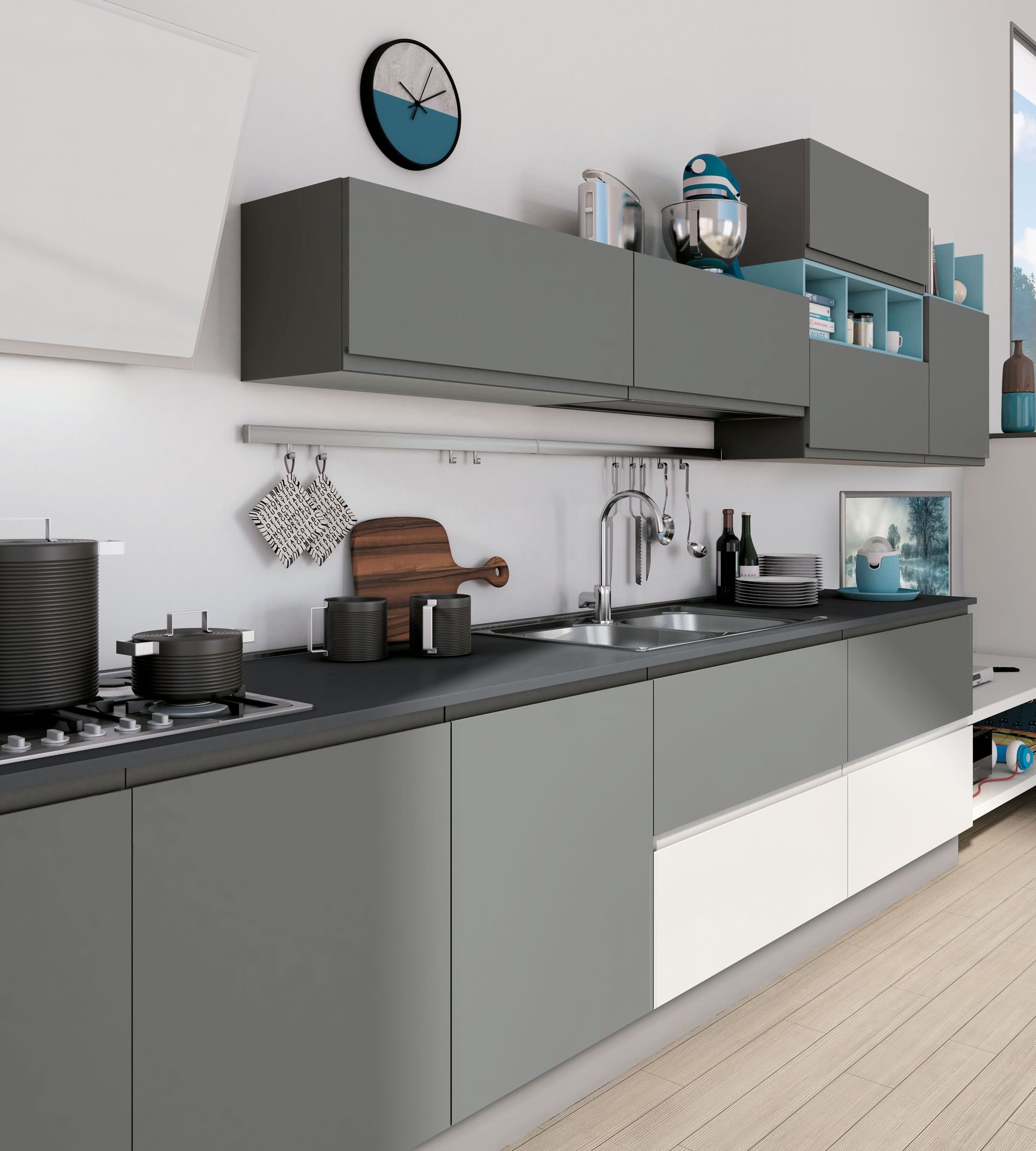 Jey feel è una cucina moderna che si apre con naturalezza al living definendo la sua anima urban chic. Valorizza e personalizza ogni spazio grazie alle combinazioni di legni effetto materico, legni effetto stone e marmo opaco per basi, colonne e piani di lavoro.