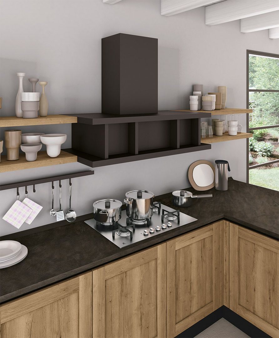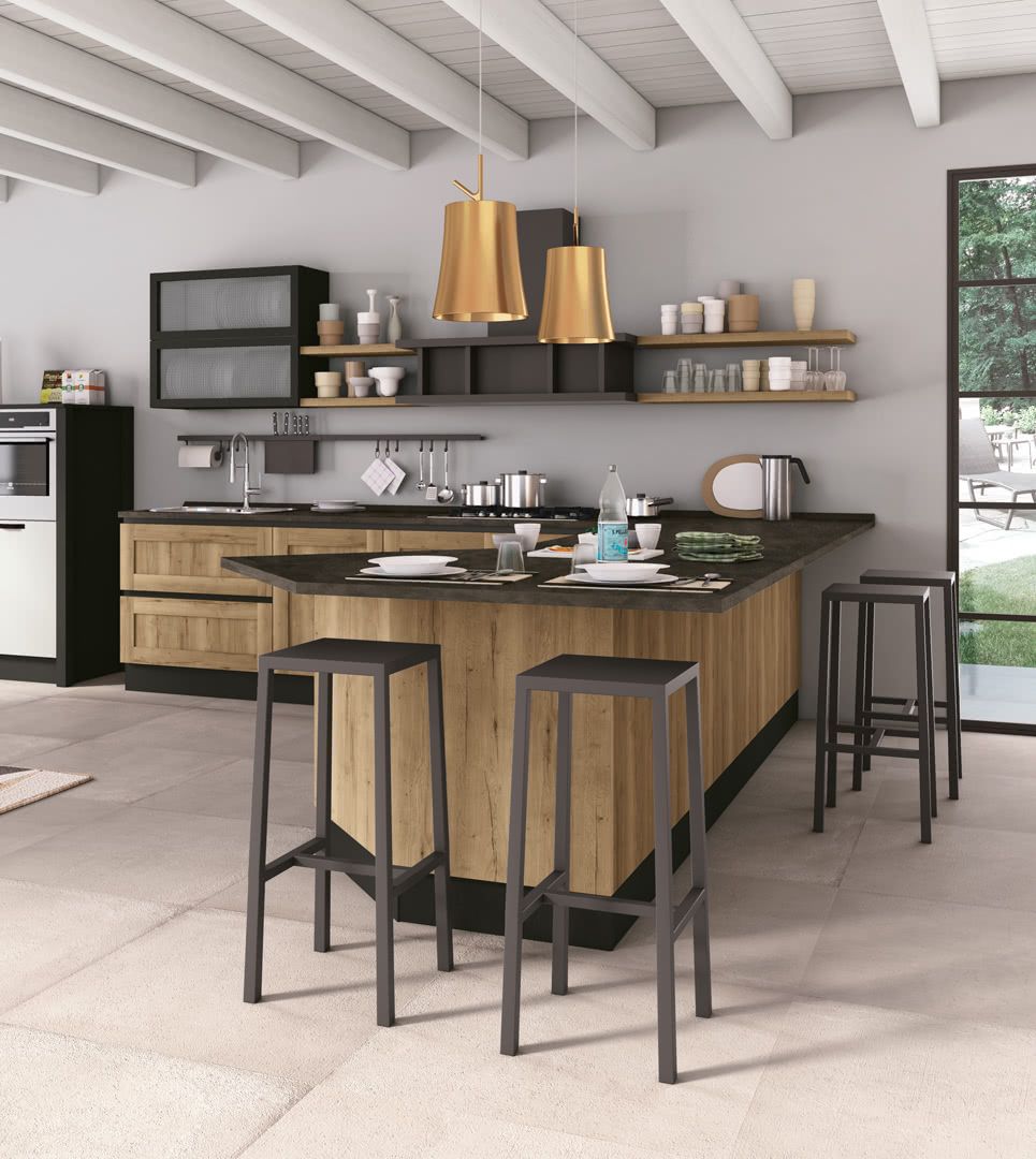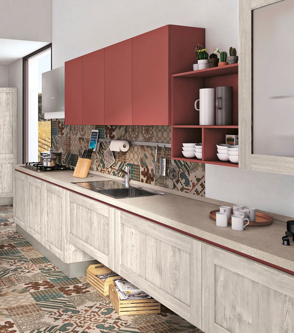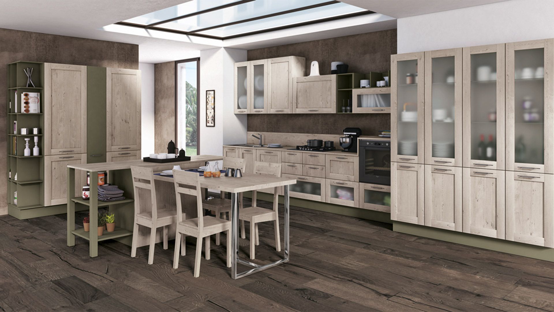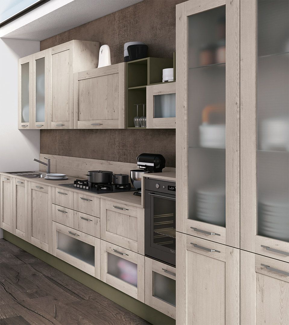 La gamma del programma Kyra si arricchisce con l'introduzione della Kyra Telaio, disponibile nelle varianti Neck senza maniglia, Bridge con maniglia e Vintage. Per conferire un tocco originale agli spazi cucina e living, è possibile abbinare le ante a telaio alle ante lisce, proposte nelle stesse finiture e colori.