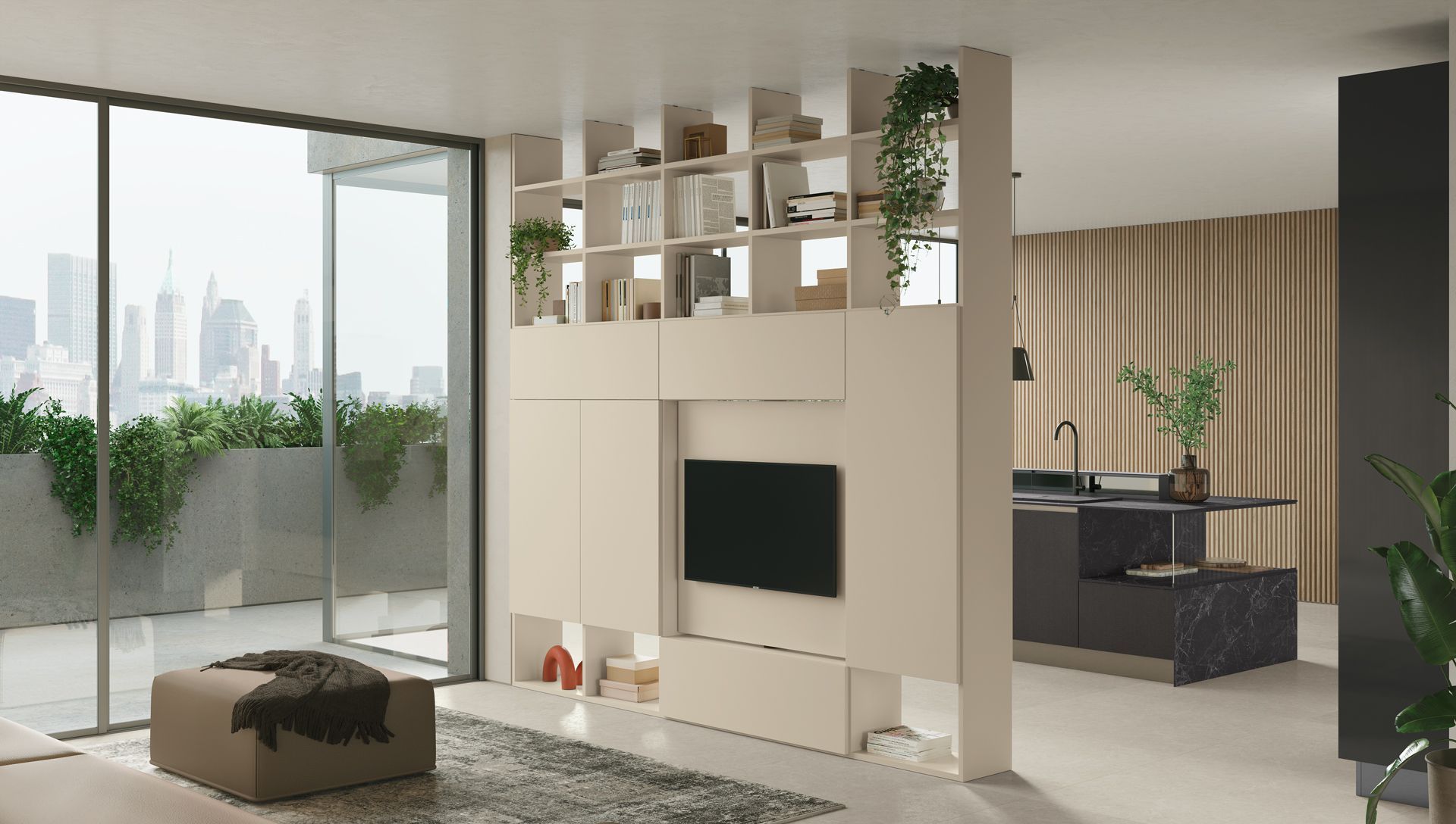 Il sistema-libreria offre una soluzione versatile per soddisfare le diverse esigenze di separazione visiva e funzionale degli ambienti. Con un design di grande impatto estetico, questa soluzione è concepita per essere accessibile da entrambi i lati, consentendo di suddividere gli spazi abitativi e definirli, pur lasciando passare la luce naturale. Questa caratteristica favorisce una significativa personalizzazione delle dimensioni degli ambienti e delle finiture. Le librerie bifacciali, integrate con un sistema a spalla, condividono le stesse caratteristiche tecniche e capacità di contenimento delle librerie a spalla.