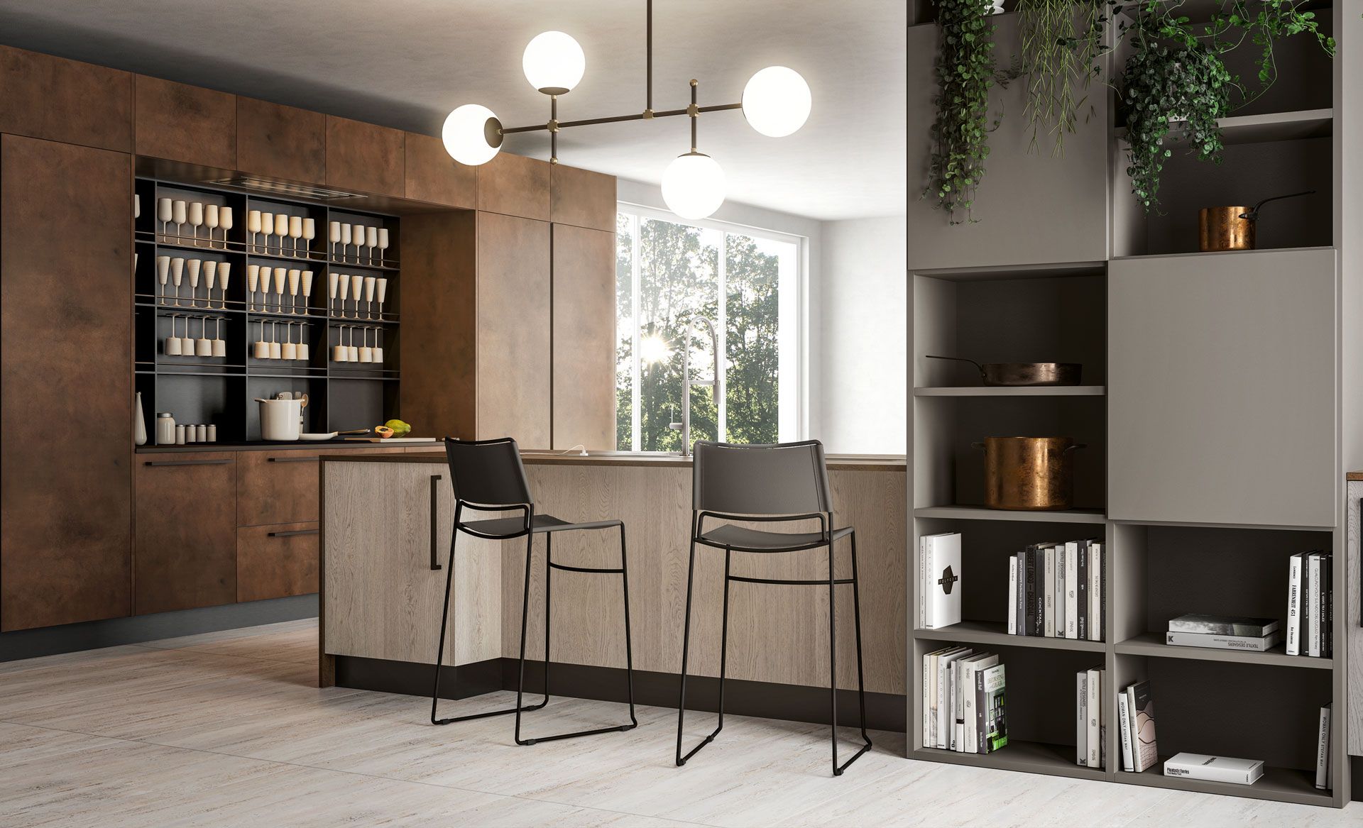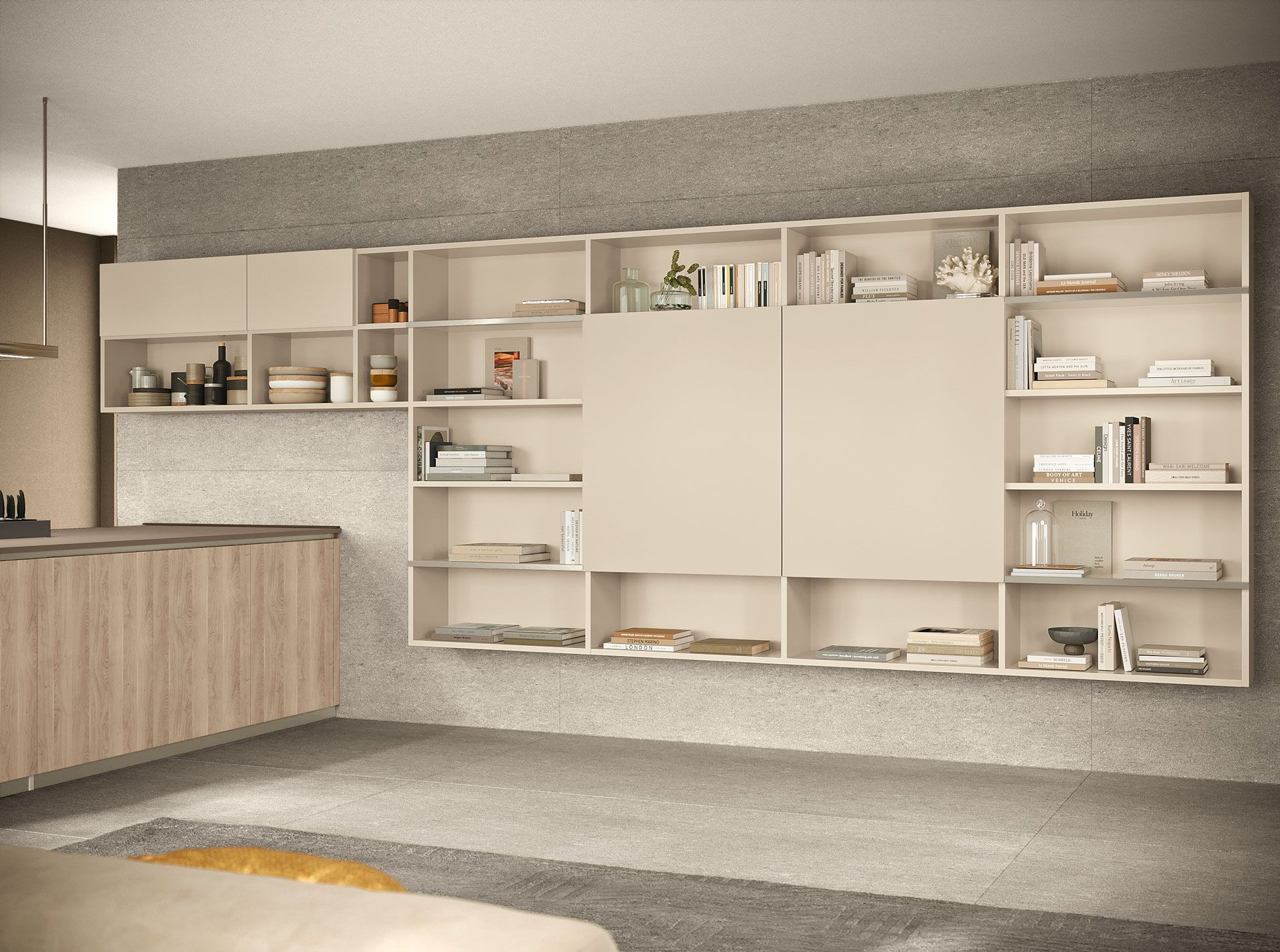 Il sistema costruttivo della libreria a spalla si integra in modo armonioso con la modularità della cucina, consentendo di creare composizioni sempre uniche e diverse. Gli spessori aumentano, garantendo solidità e rilevanza con pannelli da 25 mm, ponendo il mobile come possibile struttura a terra o sospesa, con vani aperti o chiusi, singolarmente o combinati con basi, pensili, mensole e boiserie. I molteplici elementi come accessori, colori, materiali e finiture offrono varie possibilità di personalizzazione per valorizzare ogni realizzazione.
